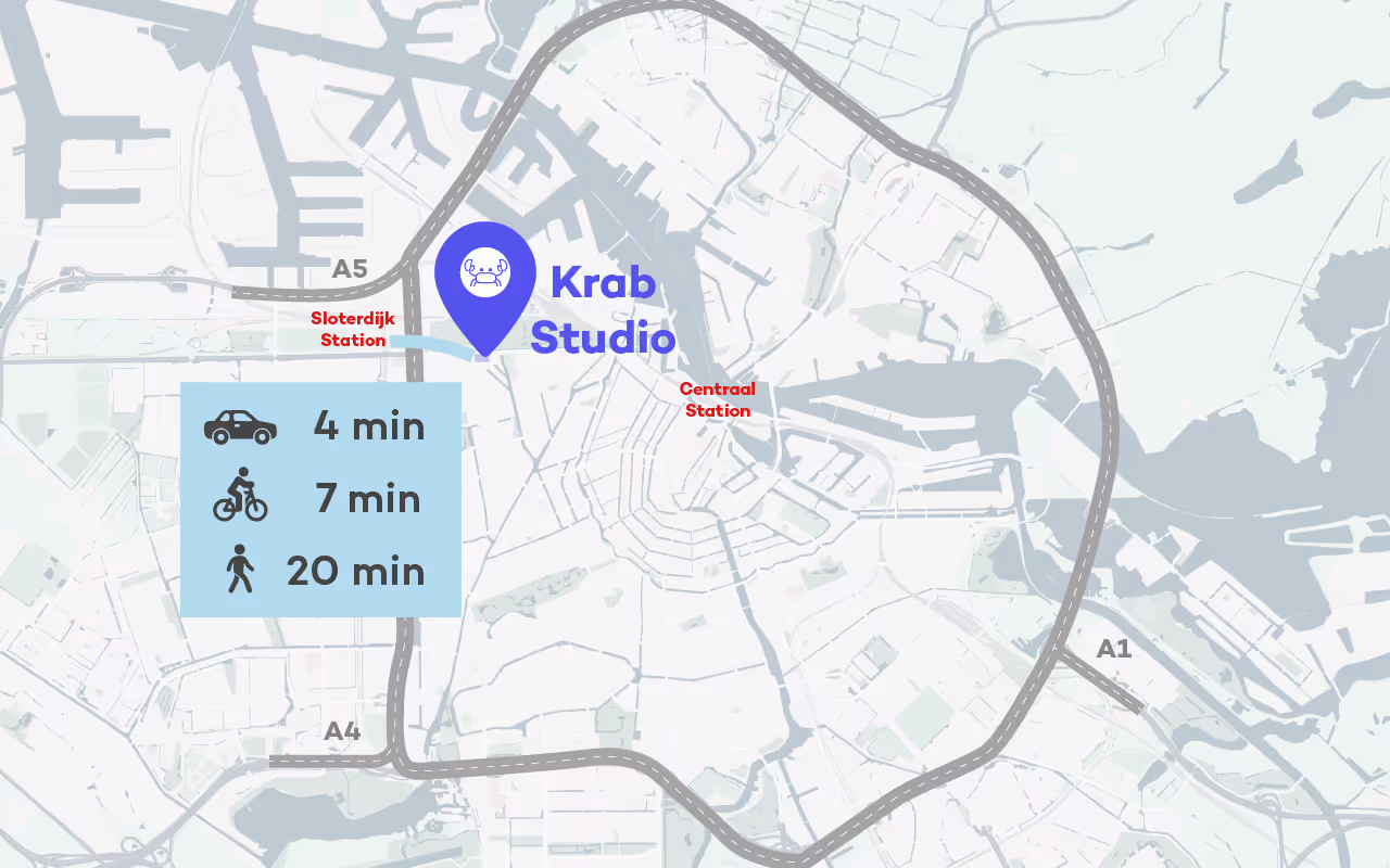 Onze volledig gerenoveerde studio van ruim 100 m² ligt in Amsterdam-West, op slechts vier minuten rijden van station Sloterdijk - zeven minuten fietsen of twintig minuten lopen. De locatie is dus perfect bereikbaar voor jou en je team. Kom je met de auto, dan kan je parkeren op het terrein.